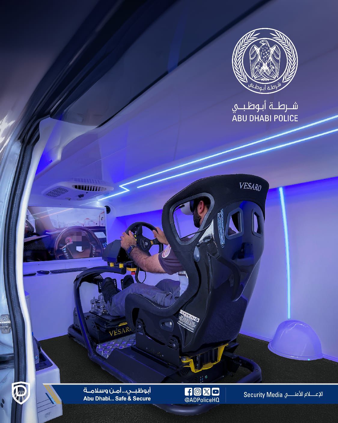 وتحتوي الدورية على جهاز محاكاة القيادة باستخدام الواقع الافتراضي إلى جانب عرض فيديوهات التوعية الرقمية بتقنية CGI .
